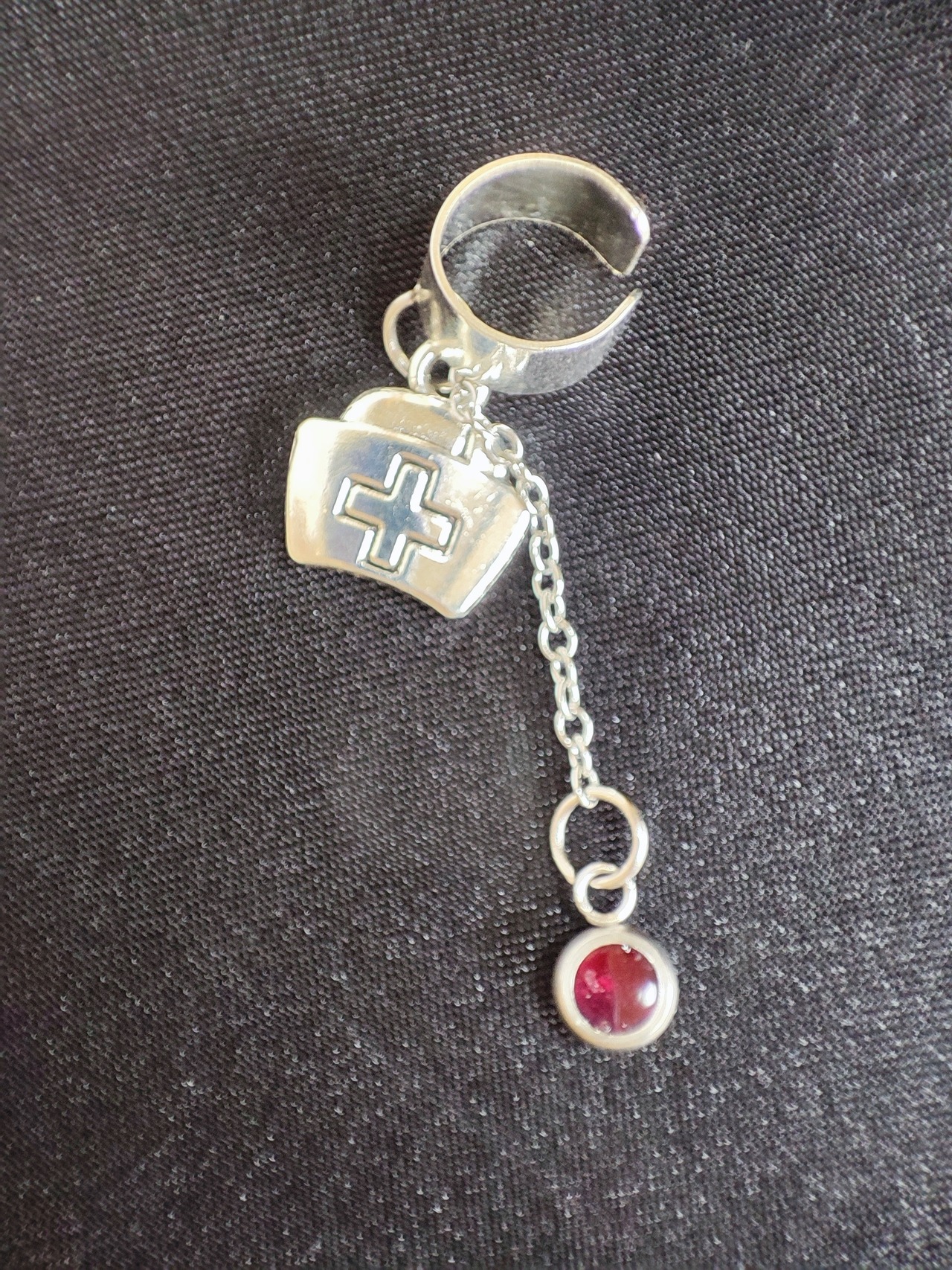 ナース帽のモチーフと、どこか無機質で整然とした印象のイヤーカフ。