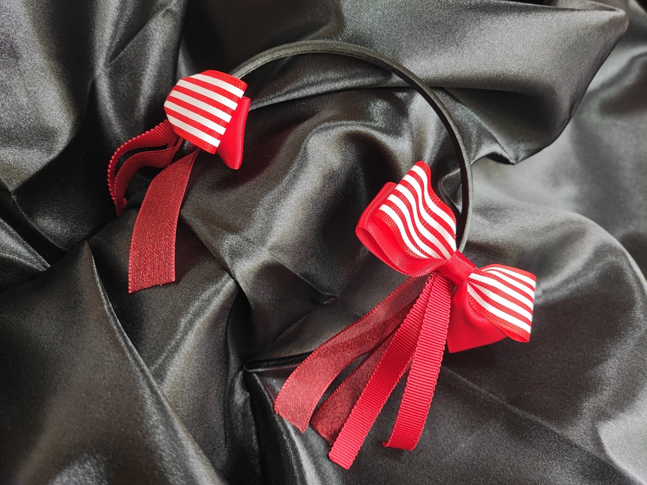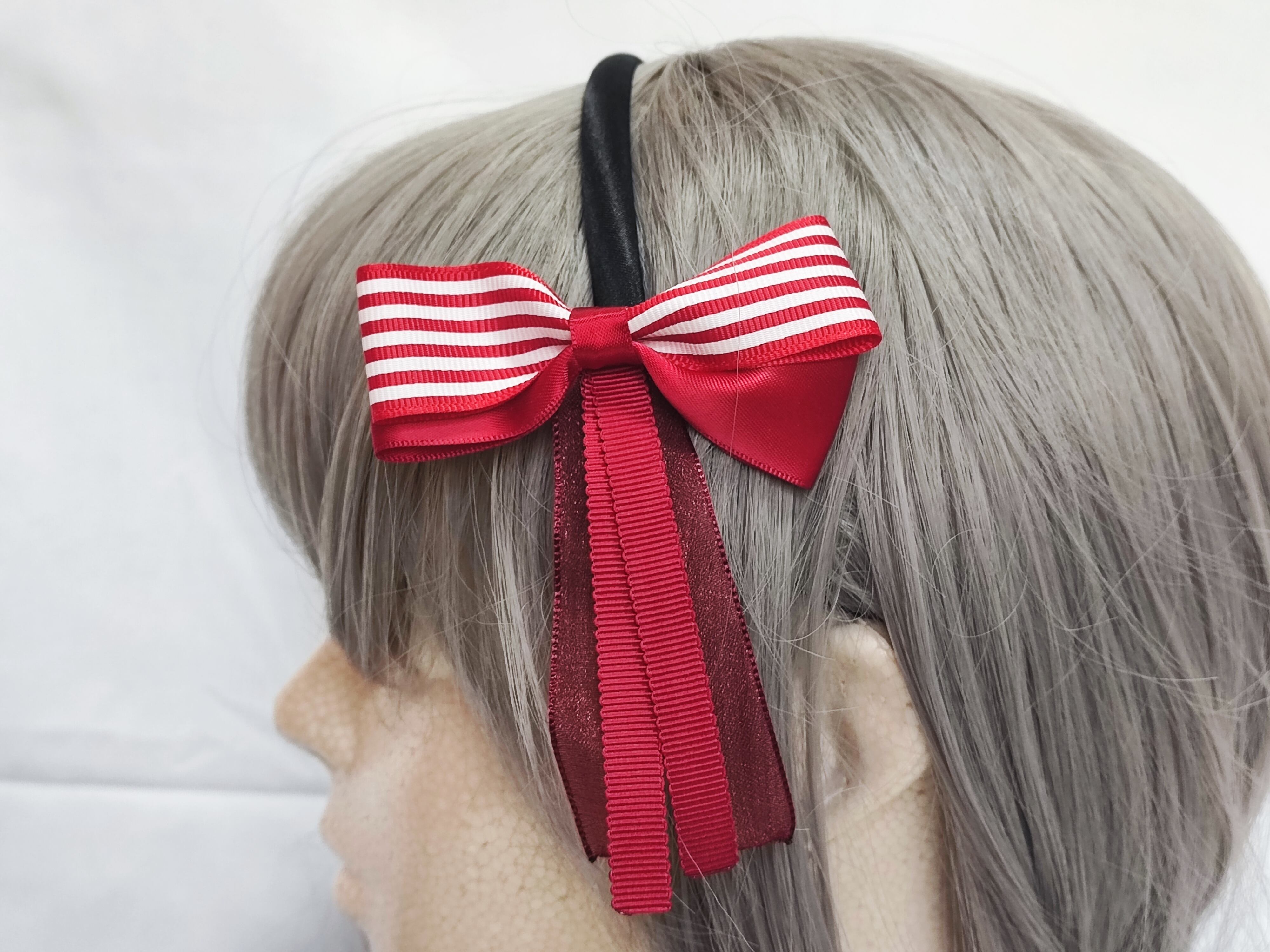そんな印象的な赤ストライプリボンをあしらった、ツインテール飾りのカチューシャです。