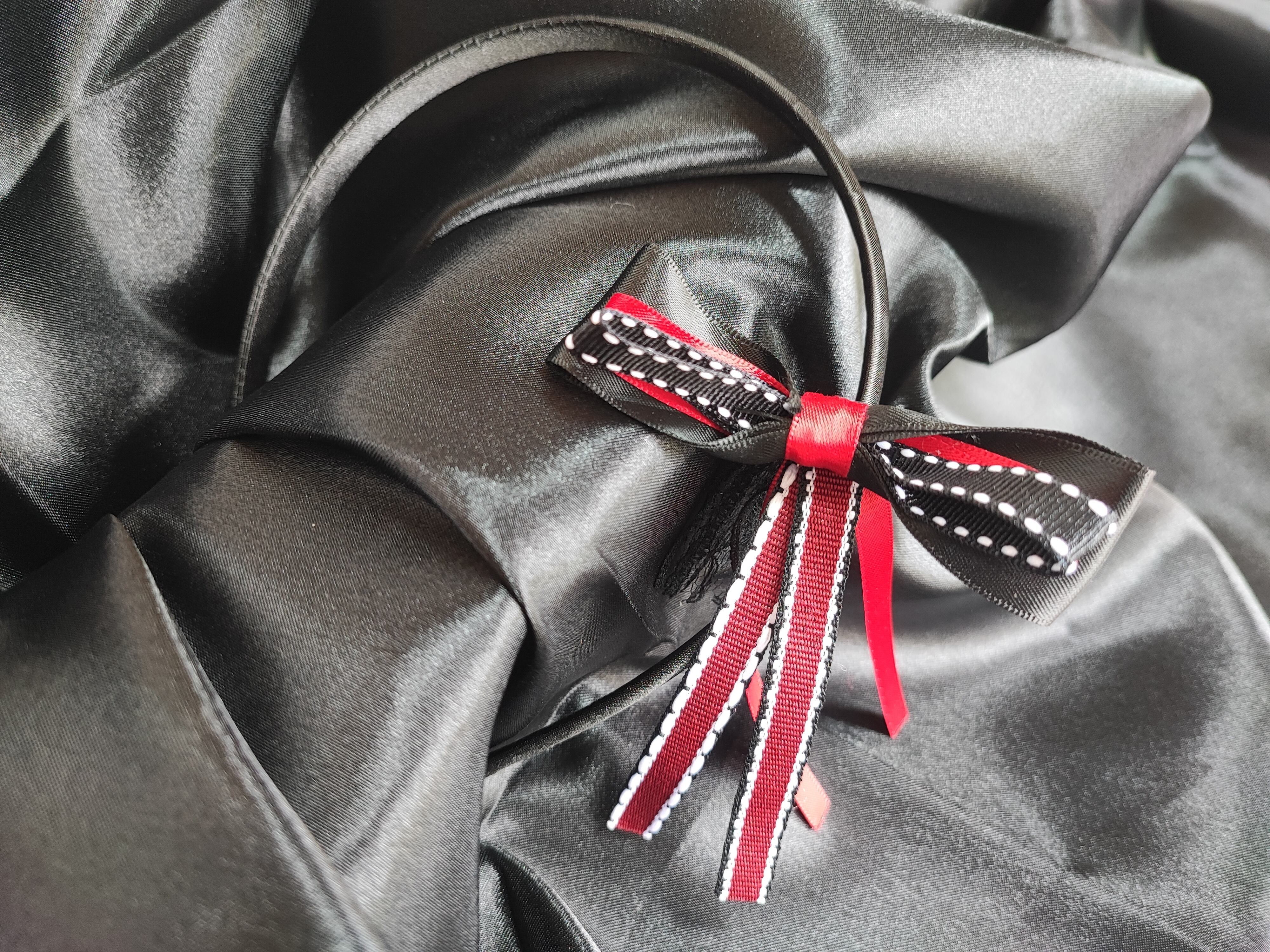 黒のしなやかな帯に、赤と白のラインが凛と映えるリボン。